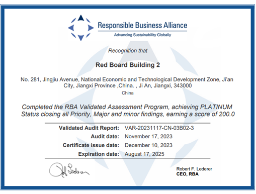 江西紅板科技股份有限公司于2019年首次獲得RBA認(rèn)證,鉑金等級(jí)(得分:200,總分:200),體現(xiàn)紅板在社會(huì)責(zé)任方面的重視和付出。紅板承諾會(huì)一如既往地滿足RBA認(rèn)證要求,重視社會(huì)責(zé)任,持續(xù)改善在社會(huì)責(zé)任方面的績(jī)效。