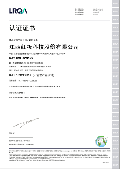 江西紅板科技股份有限公司于2009年正式獲得IATF16949體系證書,經(jīng)過多年的持續(xù)改善,已能有效的保證汽車用的線路板的品質(zhì),提升客戶滿意度。