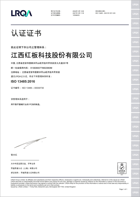 江西紅板科技股份有限公司于2021年正式獲得ISO13485體系證書,持續(xù)滿足客戶要求和適用的法規(guī)要求,并持續(xù)推動(dòng)管理體系在組織內(nèi)的有效運(yùn)用。