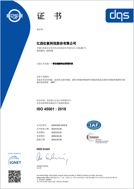 江西紅板科技股份有限公司于2020年正式獲得ISO45001體系證書,公司承諾將持續(xù)為公司員工創(chuàng)建安全、衛(wèi)生的工作環(huán)境和生活環(huán)境,確保法律法規(guī)的符合性,持續(xù)改進(jìn)職業(yè)健康安全績(jī)效,承擔(dān)一個(gè)高新技術(shù)企業(yè)的應(yīng)有的社會(huì)責(zé)任。