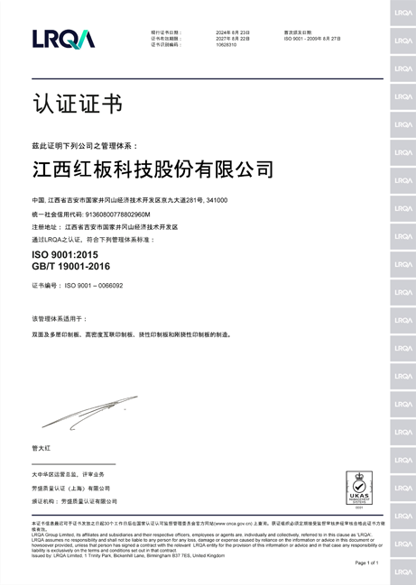 江西紅板科技股份有限公司于2009年正式獲得ISO9001體系證書,經(jīng)過多年的體系運(yùn)行,整個(gè)質(zhì)量管理體已趨近完善,各部門的績(jī)效指標(biāo)也已經(jīng)實(shí)現(xiàn)持續(xù)提升,輸出的產(chǎn)品品質(zhì)能確保獲得客戶滿意。
