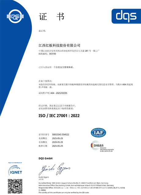 江西紅板科技股份有限公司于2020年正式獲得ISO/IEC 27001體系證書,持續(xù)有效保護(hù)公司信息安全和客戶產(chǎn)品信息。